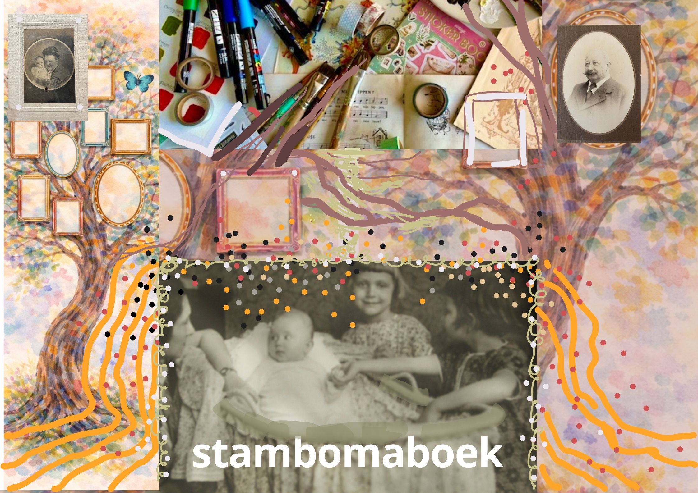 Toen ik het hoorde heb ik rustig de tijd genomen te voelen wat ik voor ons kleinkind wilde maken. Het werd een collage-boek door de tijd heen, via mijn overgrootouders naar dit nieuwste familielid in wording. Ik hou van schilderen, collages, schrijven, verbinden en iets waardevols doorgeven. Zo kwam mijn boek tot stand. Met foto’s , teksten en persoonlijke noten.
